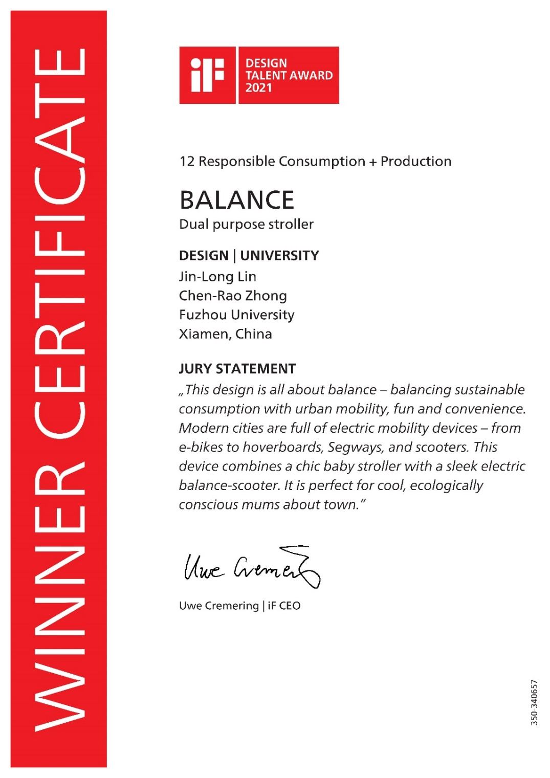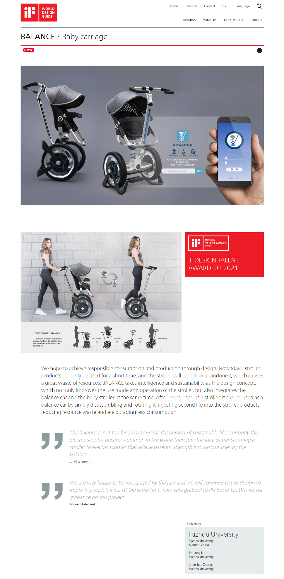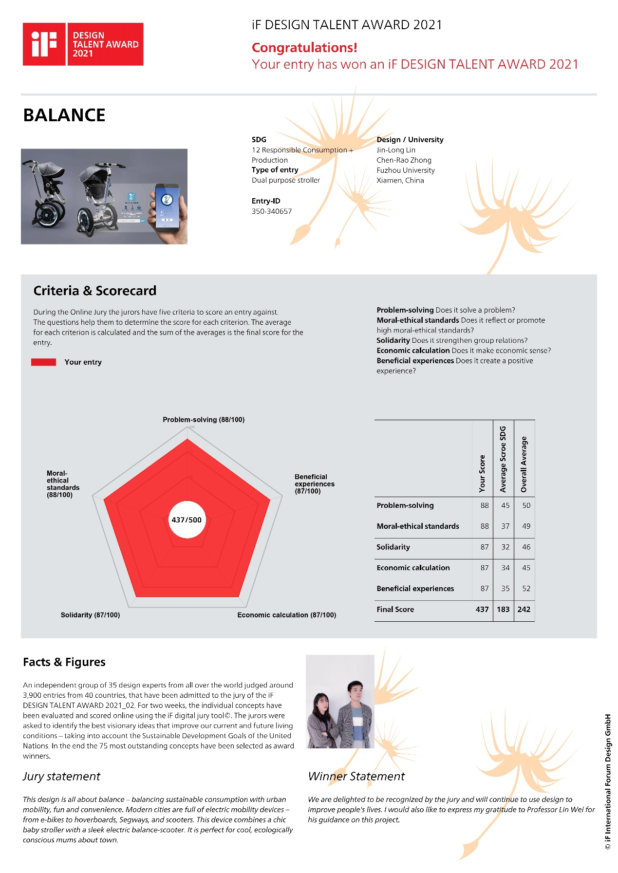 “iF设计新秀奖”是由德国历史最悠久的iF Industrie Forum Design为发掘世界年轻设计新秀、面向世界各地在校学生及毕业两年内的学生所组织的最重要的国际顶级奖项之一,其前身是iF概念设计奖。“iF设计新秀奖”为鼓励设计界新生力量而设置,也是全球设计领域中针对年轻设计师所举办的规模最大、最具名望的竞赛之一,具有国际高品质设计的象征。本设计旨在实现负责任的消费和生产。现阶段婴儿车产品只能短时间使用,婴儿车在使用结束后会闲置或废弃,造成资源的极大浪费。
