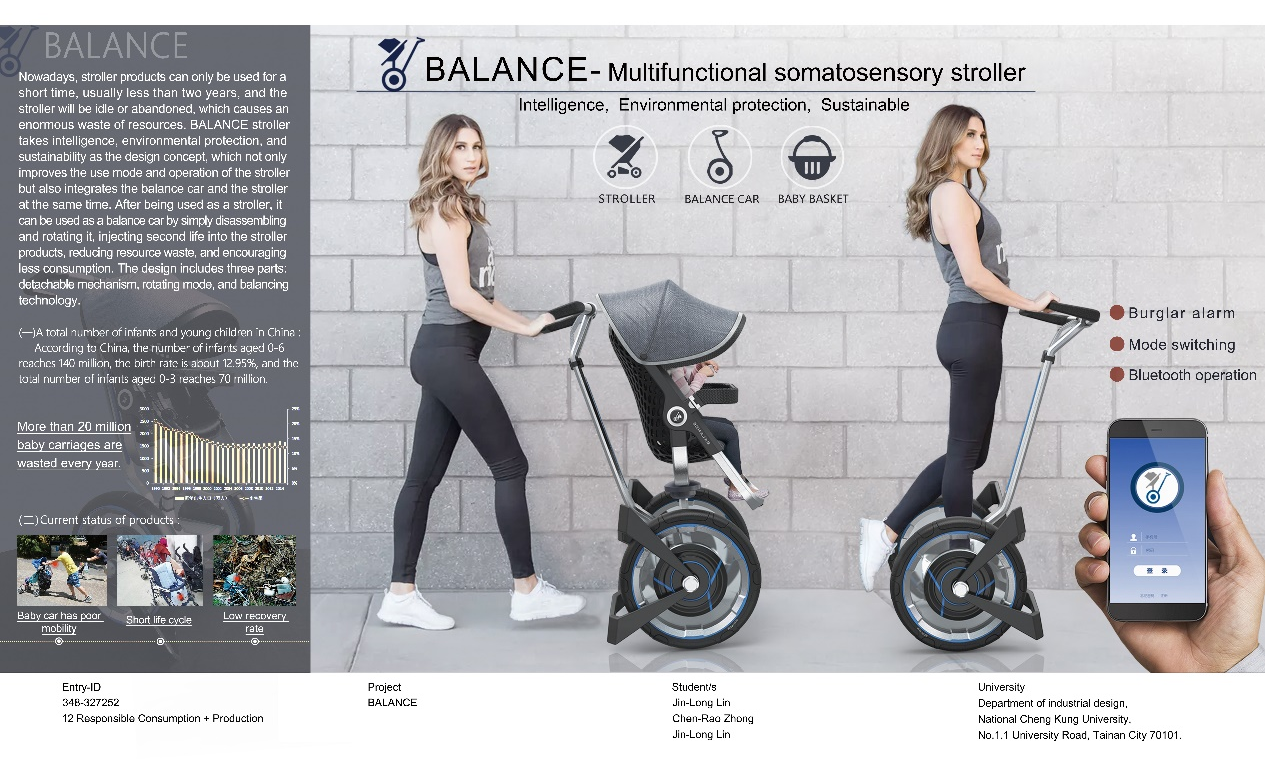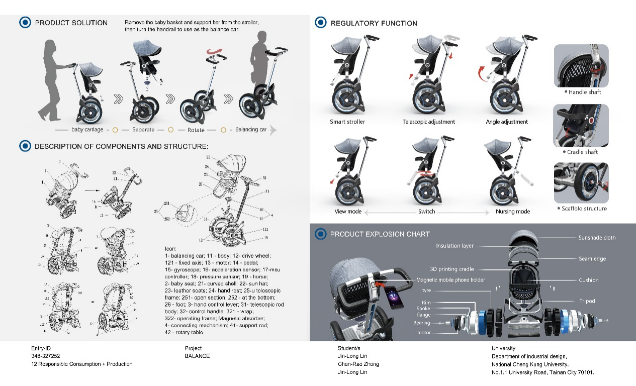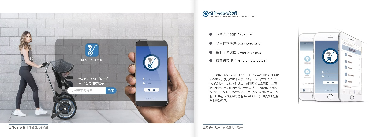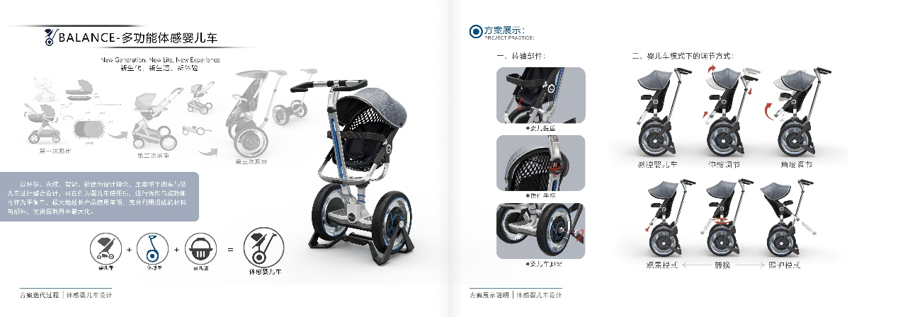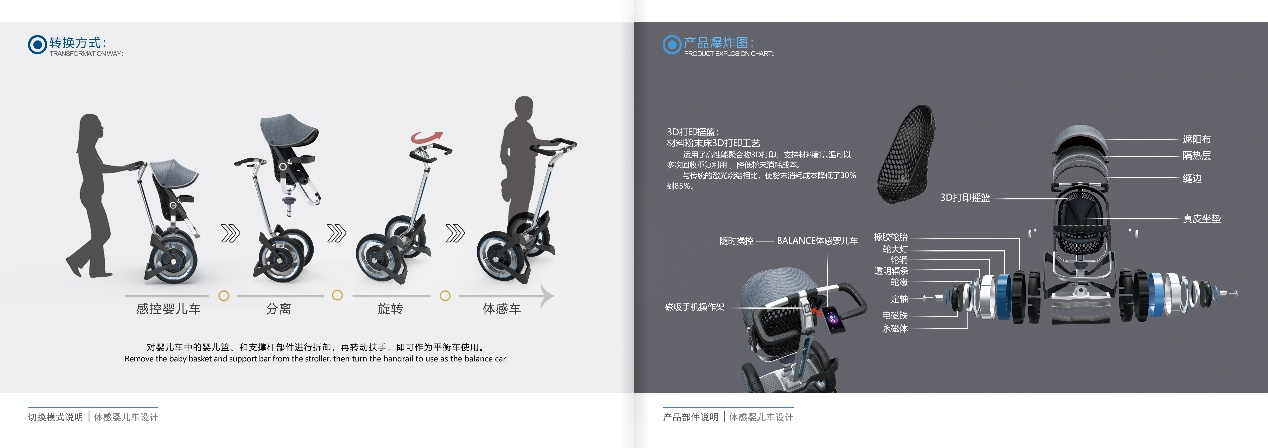 BALANCE以智能化和可持续性为设计理念,不仅改进了婴儿车的使用方式,还将平衡车和婴儿车整合在一起。并作为婴儿车使用后,只需拆卸和旋转即可作为平衡车使用,为婴儿车产品注入第二生命,减少资源浪费,鼓励更少的消费。BALANCE还包括了拆件机构、转动模式、平衡技术三大部分的设计。